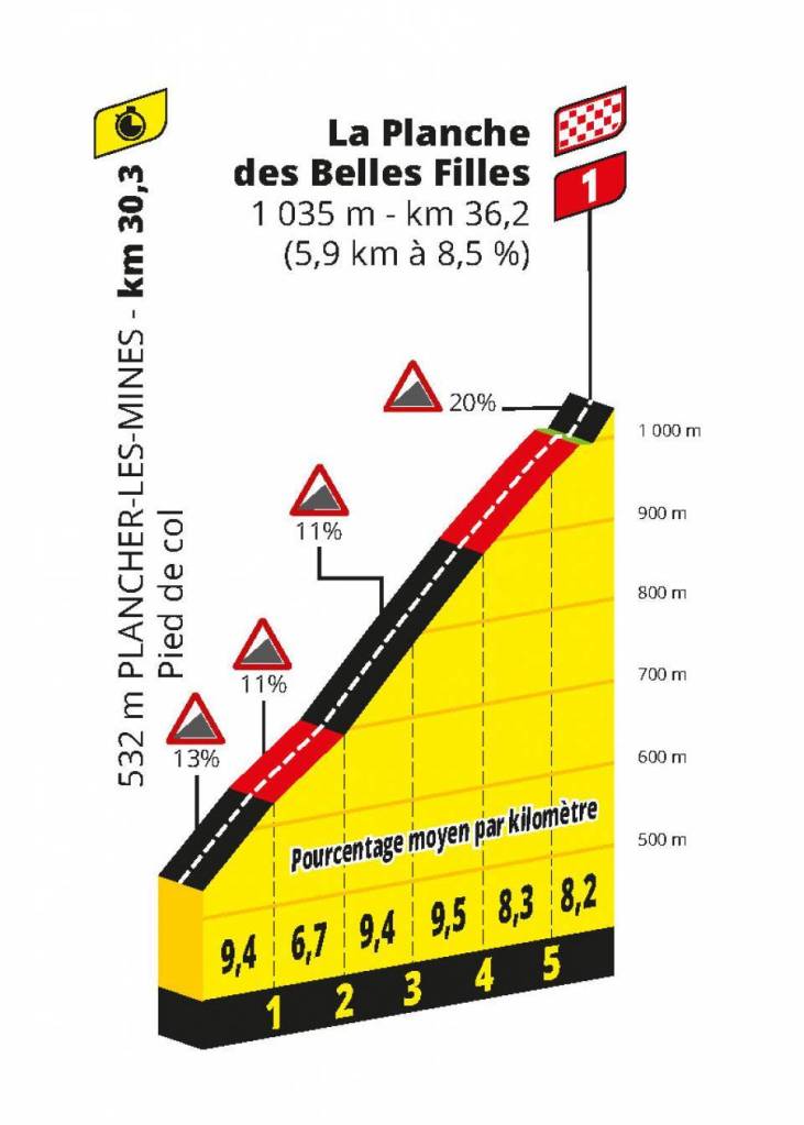 Race organizers have thrown a wrench into the traditional time trial this year. Instead of a relatively flat course, the route meanders up and down for about 30 kilometers, when it heads up the category 1 Planche des Belles Filles for the final six kilometers. With gradients approaching 9% at various points on the slope, this climb could cause some reshuffling in the standings of the top ten GC contenders.