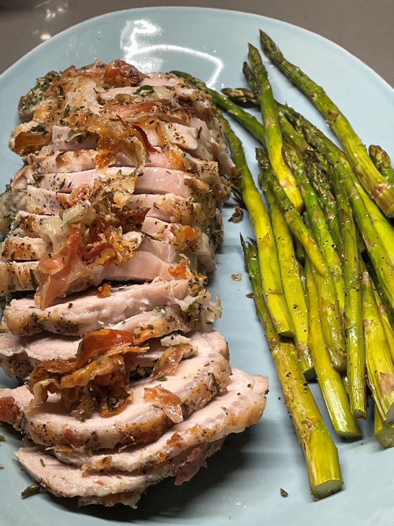 I paired it with an Italian-style pork roast flavored with rosemary and garlic, and topped with thin slices of pancetta. The fruity, high-acid Barbera was a lovely match, even with the roasted asparagus I served alongside.
