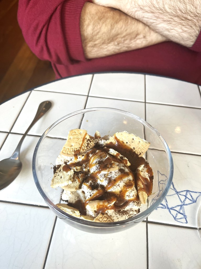 Dessert was a fun, light affair called a biscuit cake: plain, vanilla cookies interlaced with barely sweetened whipped cream and topped with caramel sauce. Gabe enjoyed every bite with his coffee.