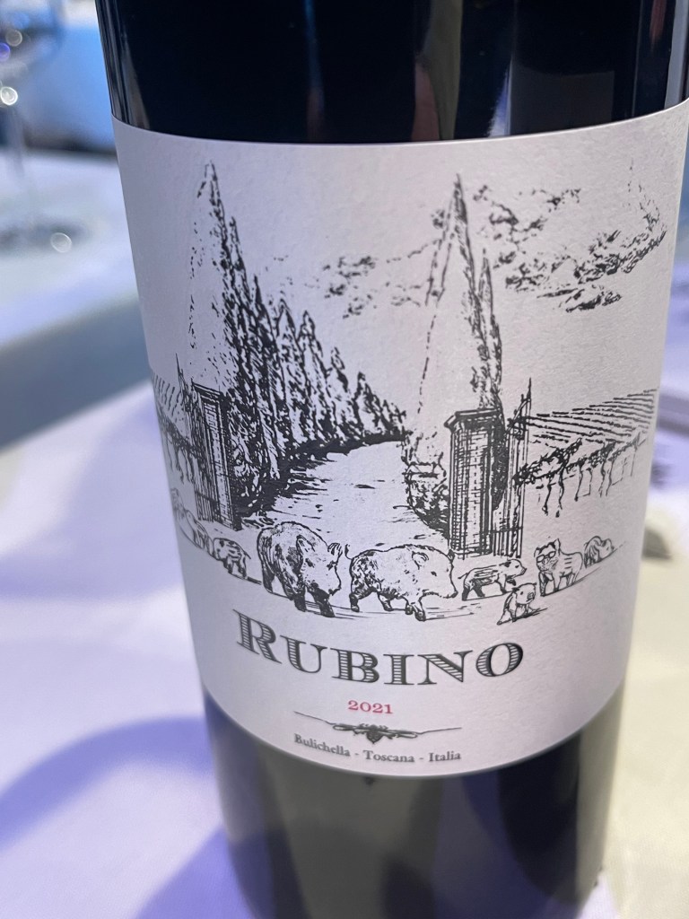 Bulichella’s standard bearer, this wine is a blend of Sangiovese, Merlot, and Cabernet Sauvignon. Nicolò pointed out the label illustration, which features two adult wild boars with seven babies, seeming to enjoy themselves in the vineyard. He explained two reasons for the illustration: wild boars are common in Suvereto and indeed enjoy the vineyards. Also, the adult animals represent his grandparents Hideyuki and Marisa, and the babies are their seven children!
