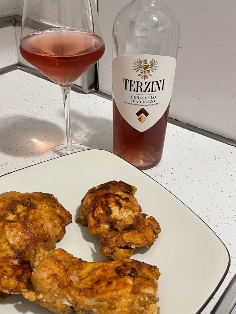 I sampled these wines last month during the Slow Wine USA event in NYC (all were from the 2023 vintage; all labeled at 14% abv). As you can see, they were also deeply pigmented, varying from pink-magenta to crimson red. And quite full-bodied, too, compared to Provençal-style rosés. But I think the extra structure and body expand the possible food-pairing options: maybe grilled steak, wild game, or aged cheeses. I did manage to try the Cantina Terzini wine with food: chicken thighs marinated in a spicy, soy concoction. Absolutely delish!