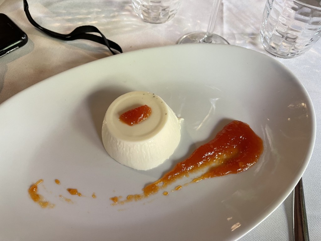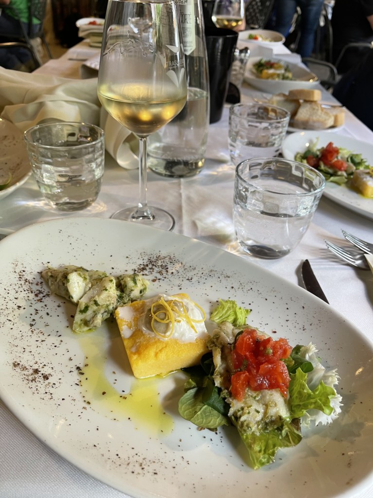 - Crisp polenta with stracciatella, smoked fish pate, and lemon zest topped with filet of perch marinated in valerian and topped with tomato concasse and salsa verde