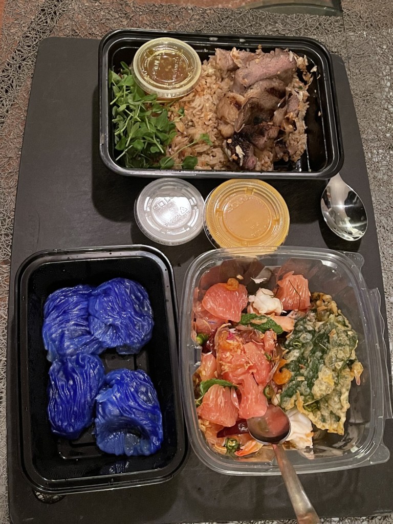 The balance between perfect ripeness and tart acidity was exquisite. Such a pleasure to drink! And it worked very well with our favorite Thai food, in this case, a selection of dishes across the flavor spectrum . . .