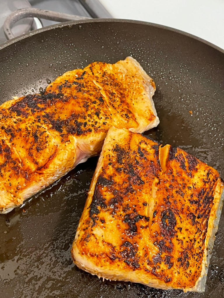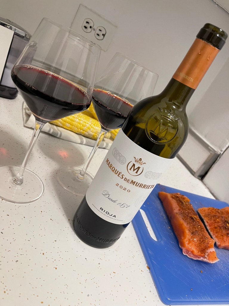 Seared king salmon seasoned with salt, pepper, brown sugar, and tajín; and fresh corn on the cob from a local farm. As I’m getting reacquainted with Rioja, I’m also rethinking traditional pairings for it. Red wine with fish? I say yes, absolutely!