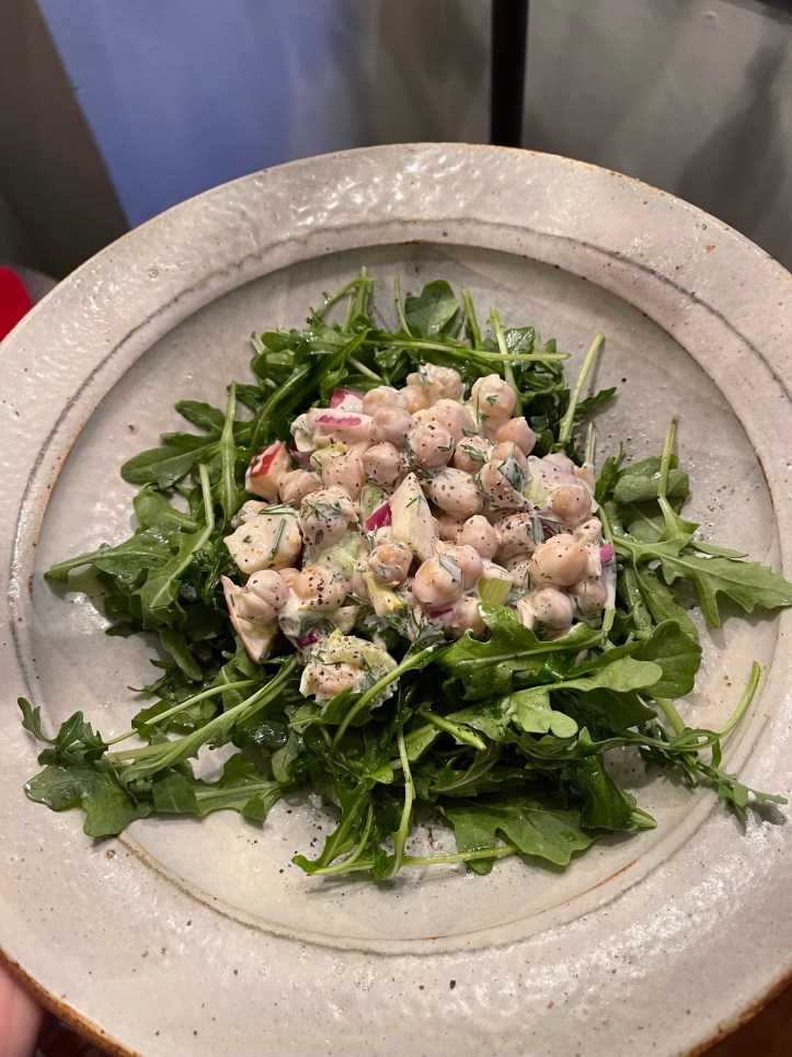 I pulled out a recipe I’ve made before, a simple one from the New York Times that is light on effort yet big on flavor. Best of all, I didn’t break a sweat doing it! If you’ve got a few cans of chickpeas, a tub of yogurt, and a mix of fresh herbs at hand, you’re halfway there. I added thinly sliced red onion and half a red apple, diced, as well as a little honey to the dressing. It’s vegetarian as written, but you could easily make it vegan with a few substitutions. Here’s a link to the recipe.