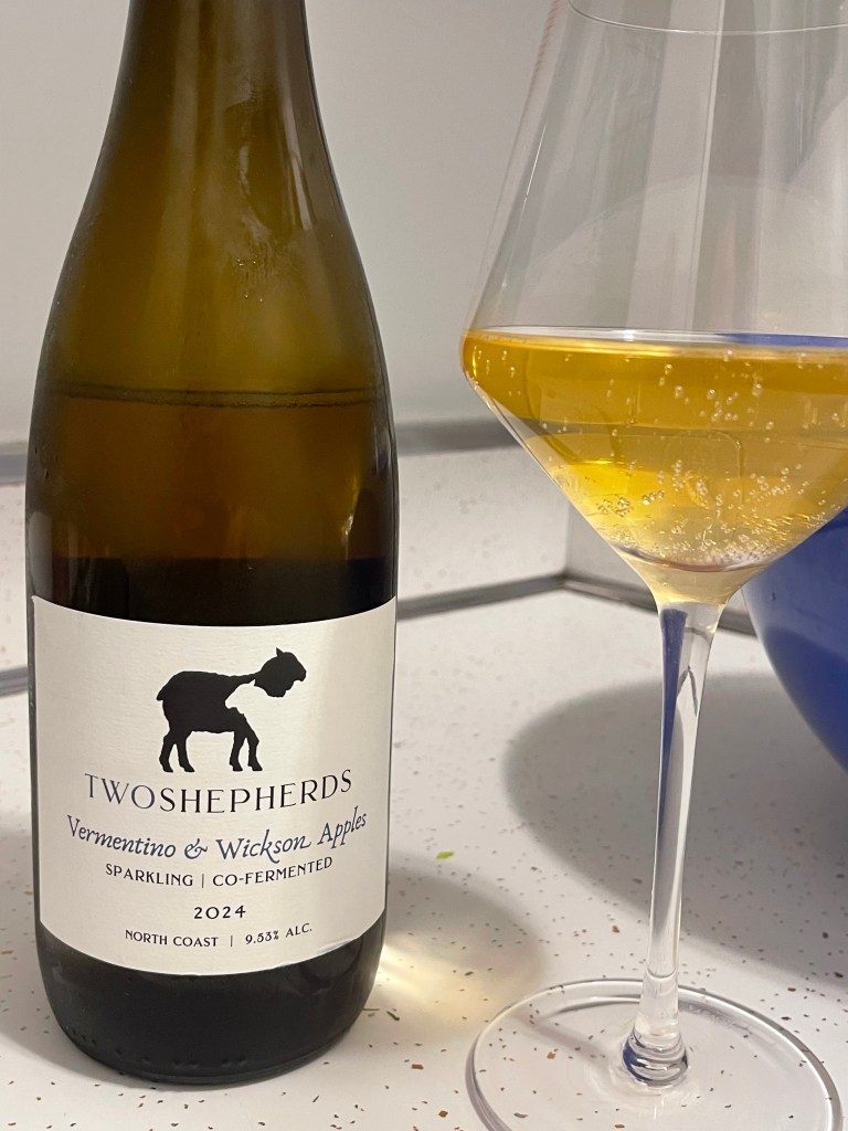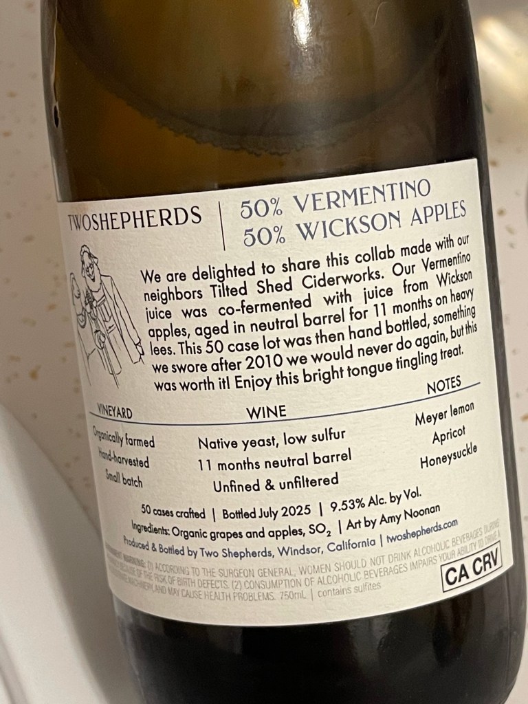 2024 Two Shepherds Vermentino and Wickson Apple Co-Ferment (9.5% abv; $32 but on sale now for $21)